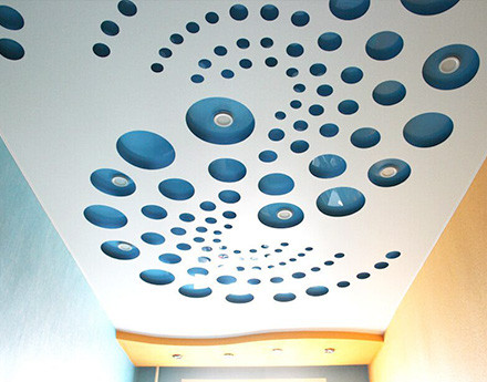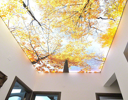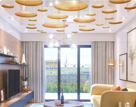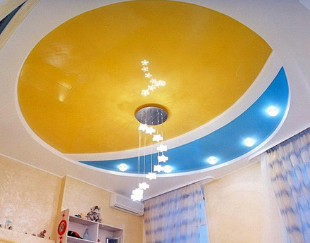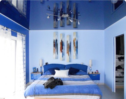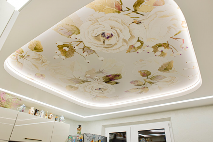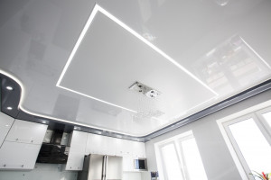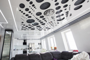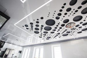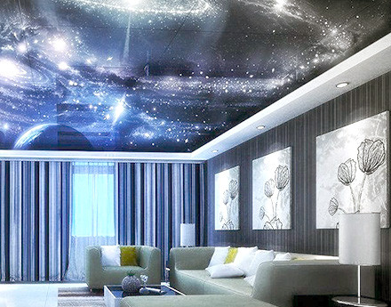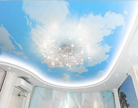 - при выборе цвета обращайте внимание и на назначение помещения, и на другие элементы отделки (обои, полы, аксессуары). В гостиных и детских хорошо смотрятся потолки «Звездное небо» или «Небо с облаками», если есть желание привлечь внимание, а если нужен универсальный вариант, подойдет белый глянцевый, матовый или тканевый;