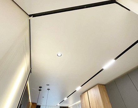 - важна и цена. Чтобы монтаж натяжного полотна не бил по карману, обратите внимание на скидки, рассрочку или бюджетные варианты, которые прослужат много лет без потери качества. Самым доступным считается глянцевый материал в белом цвете. Если установить его с одной люстрой в базовой комплектации без сложных двухуровневых конструкций, вы получите натяжной потолок, подходящий к любому интерьеру по невысокой цене.