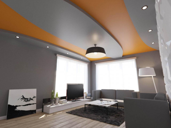 Есть очень много вариантов потолочных конструкций в несколько уровней: это классические перепады высот, перфорация нижнего яруса, установленного строго под верхним, потолок пропускающий свет с трехмерным эффектом.