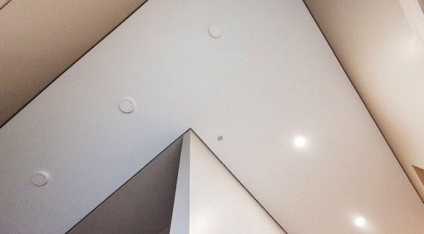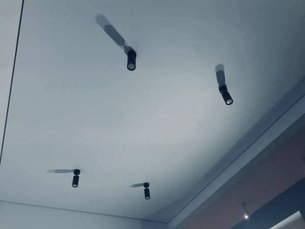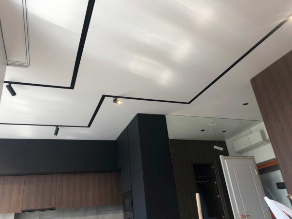 Теневые потолки характерны графичными стыками и углами. Специальный профиль черного цвета с технологическим зазором в 6 мм остается открытым — таким образом, визуально стык выделен контуром. Это смотрится эффектно и позволяет избежать таких элементов, как маскировочные ленты, потолочные плинтуса.